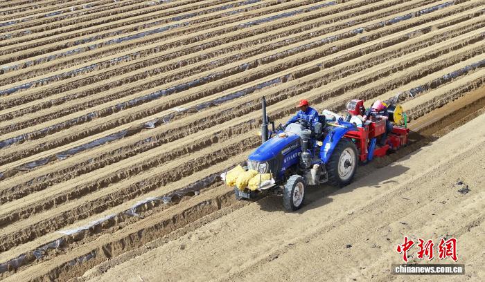 正在苦肃弛掖市平易近乐县土豆栽培基天,1体化收获机正实行收获功课。邹图画 摄