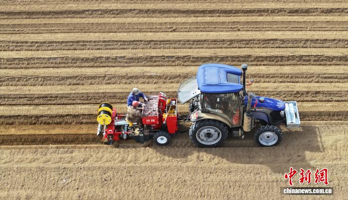 正在苦肃弛掖市平易近乐县土豆栽培基天,1体化收获机正实行收获功课。邹图画 摄